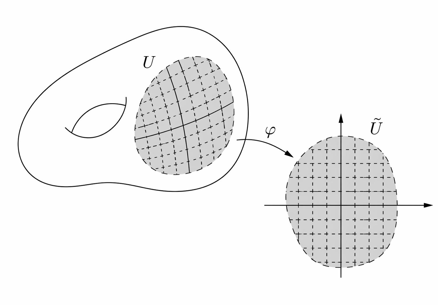 To understand how this works, let’s restrict ourselves to a specific type of topological spaces, called topological manifolds (or simply manifolds for short). Formally, a manifold is a locally Euclidean Haussdord second-countable topological space. Locally Euclidean means that for every point, there is a neighborhood that is homeomorphic to an open subset of \(\mathbb{R}^n\) (for some \(n\)), like in the following example (image taken from Daniel Irvine’s lecture notes):