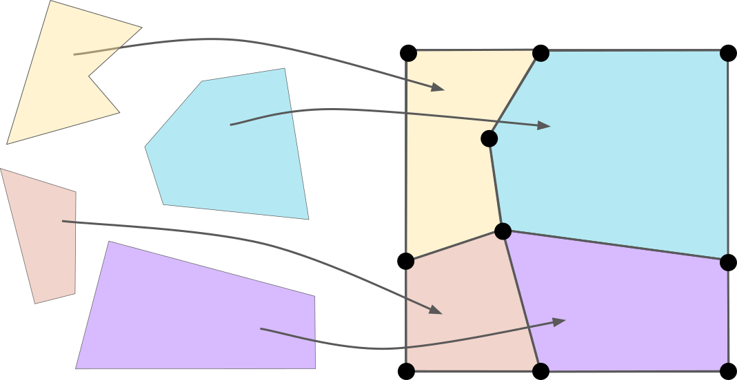 A nice property of manifolds is that they can be cellulated. There are many ways to define cellulations on a manifold. A simple way, which is the most relevant in the context of quantum error correction, is by using polytopes (the \(D\)-dimensional generalization of polygons). The cellulation of a manifold can then be defined as a set of polytopes, and a map (homeomorphism) from every polytope to the manifold, such that the manifold is fully covered and the polytopes only intersect at their faces. Here is an example of cellulation of 2D torus: